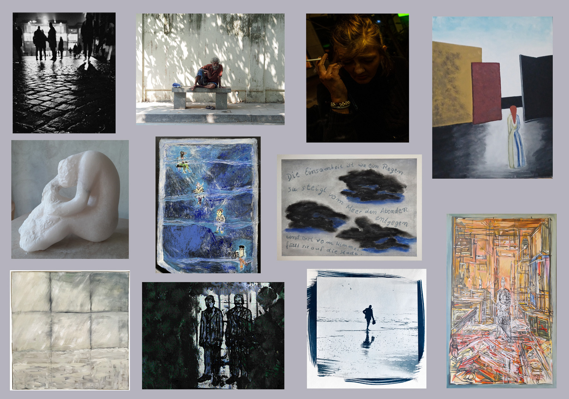In vielen Arbeiten, insbesondere den Fotos, spiegeln sich deutlich Einsamkeit, Verlorenheit, Trauer, Dunkelheit, aber auch Hoffnung auf Verbundenheit und Liebe zu den Menschen und der Natur. Sie machen Hoffnung auf den Wandel von Einsamkeit zu Glück und neuen Lebensmut.