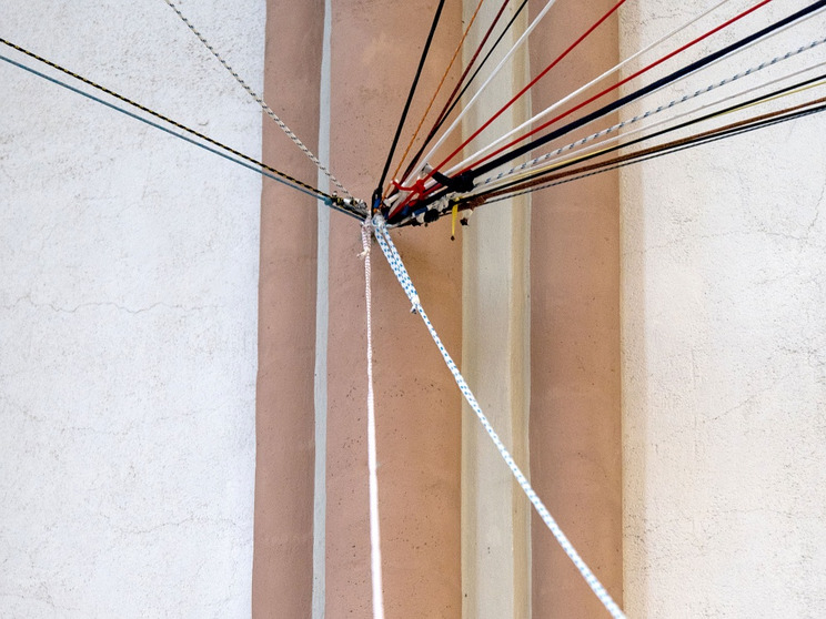 „OBDACH BODEN“ ist eine ortsspezifische Installation in der Kulturkirche St. Stephani Bremen. Sie verfolgt Fragen nach einem „Zuhause- und Verbunden-Sein“. Thematisiert wird einerseits das Zuhause als eine konkret konstruierte Architektur bzw. allgemeiner, als ein Ort des Schutzes. Andererseits aber auch als der innere Ort des sich-Zuhause-fühlens im Sinne des Verbündet- und Verwoben- Seins. Die Arbeit versucht, die Begriffe „Zuhause“ und „Obdach“ aufzufächern und zu erweitern. So entwirft sie eine Sicht auf das Habitat des Menschen als ein komplexes Geflecht von Verbindungen und Verwebungen zwischen Lebewesen, aber auch zu Dingen auf der Erde und zur Erde selbst.